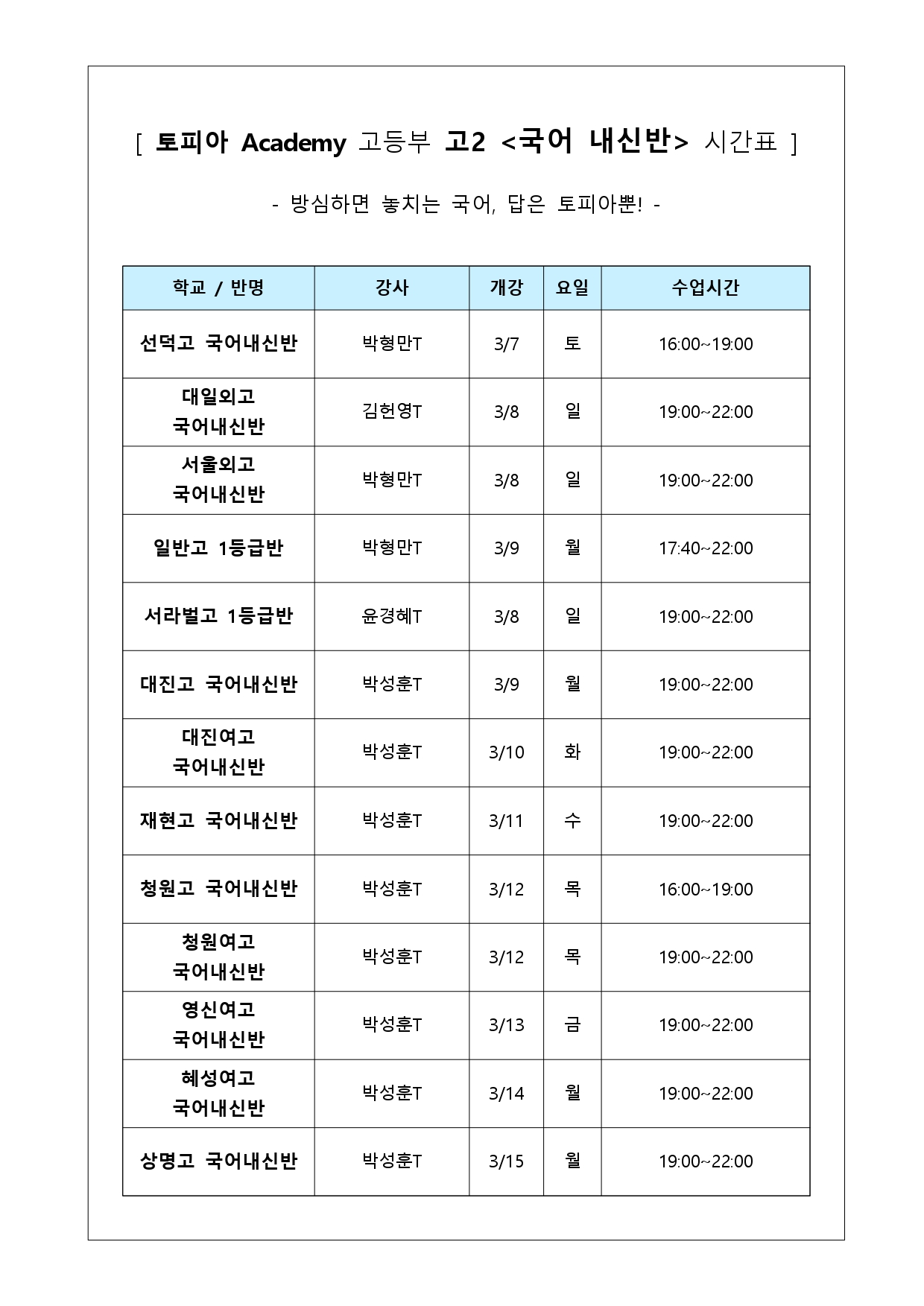 [TOPIA °íµîºÎ]°í2 3¿ù Çб³º° ³»½Å ±¹¾î½Ã°£Ç¥