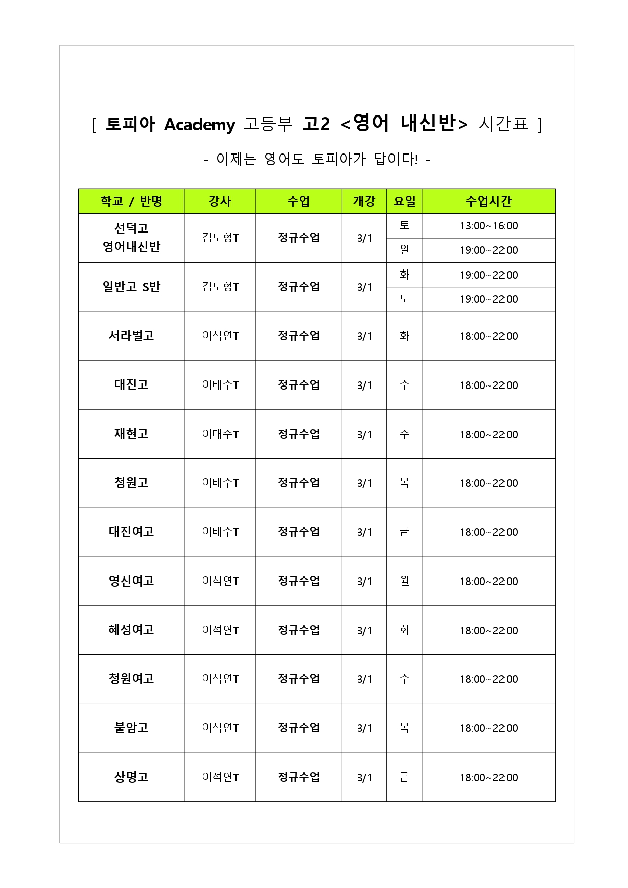 [TOPIA °íµîºÎ]°í2 3¿ù Çб³º° ³»½Å ¿µ¾î½Ã°£Ç¥