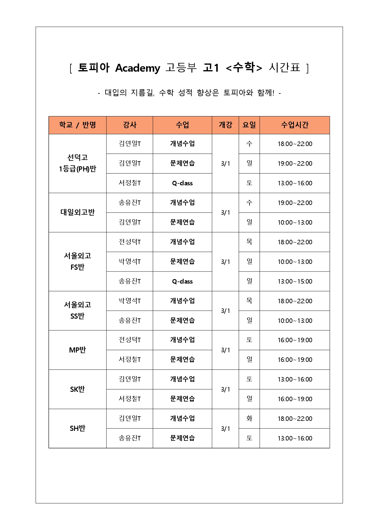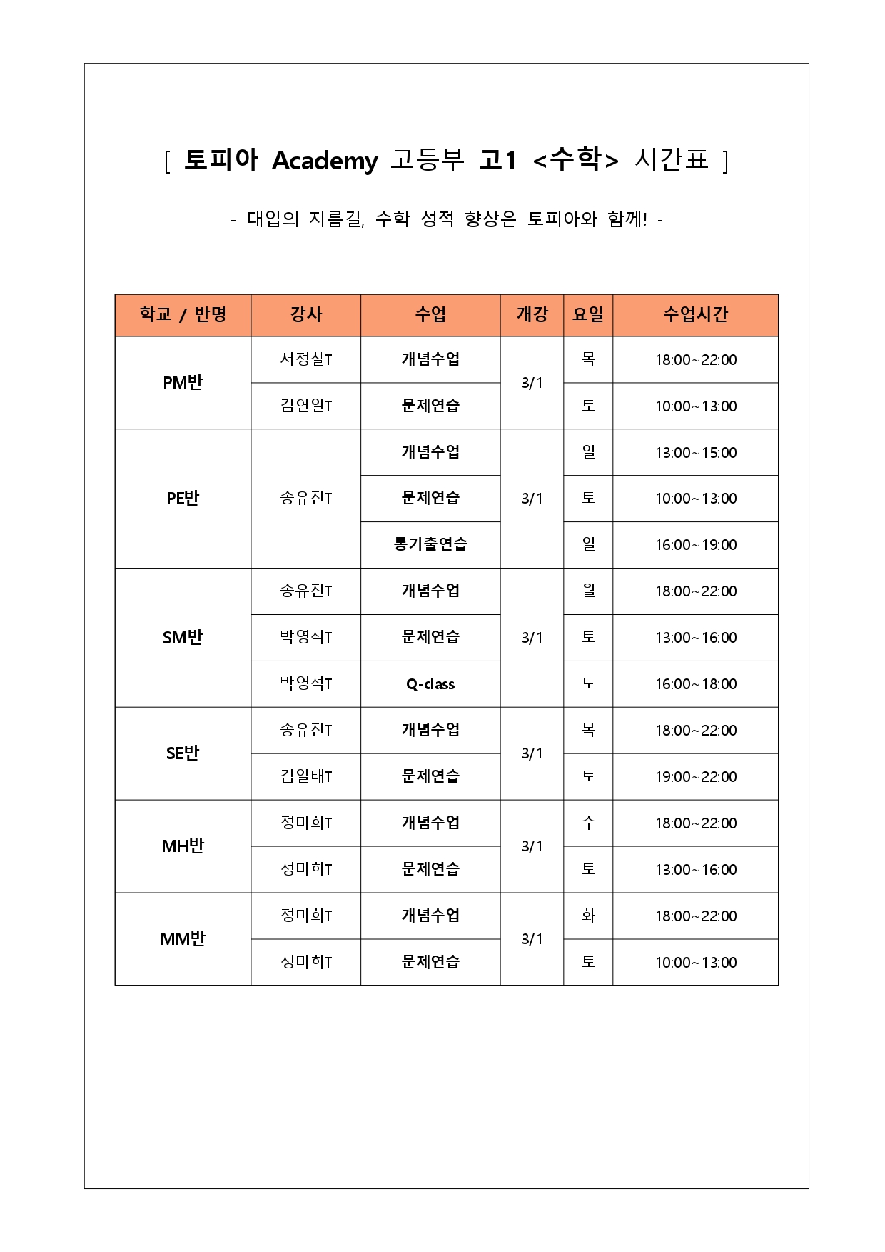 [TOPIA °íµîºÎ]°í1 3¿ù Çб³º° ³»½Å ¼öÇнð£Ç¥