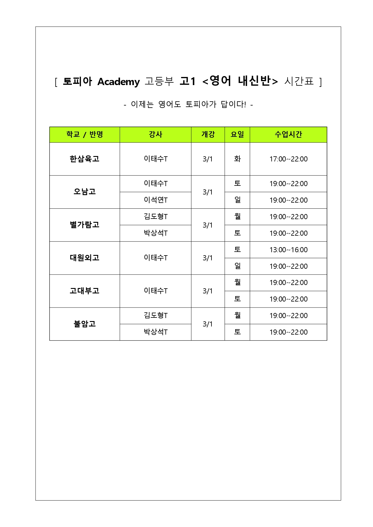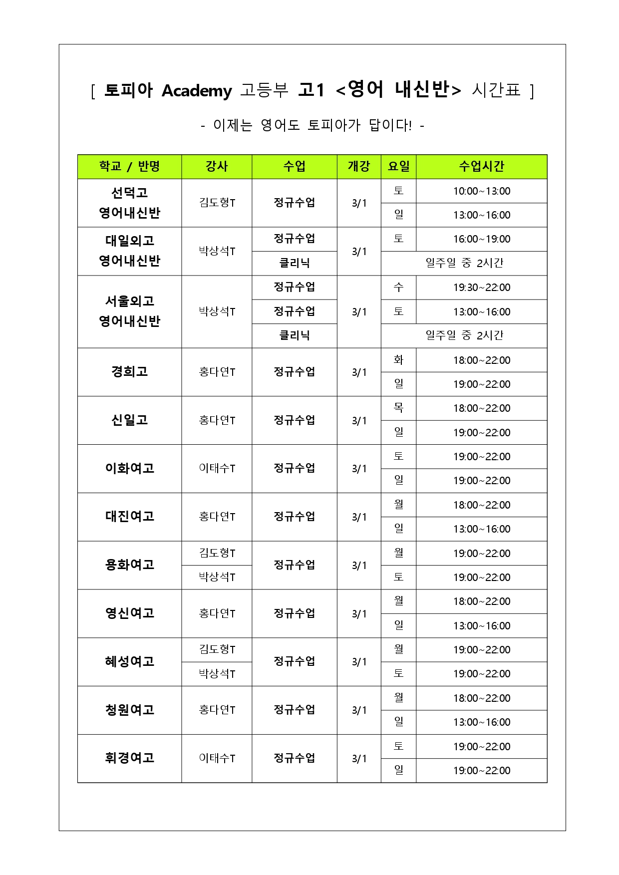 [TOPIA °íµîºÎ]°í1 3¿ù Çб³º° ³»½Å ¿µ¾î½Ã°£Ç¥